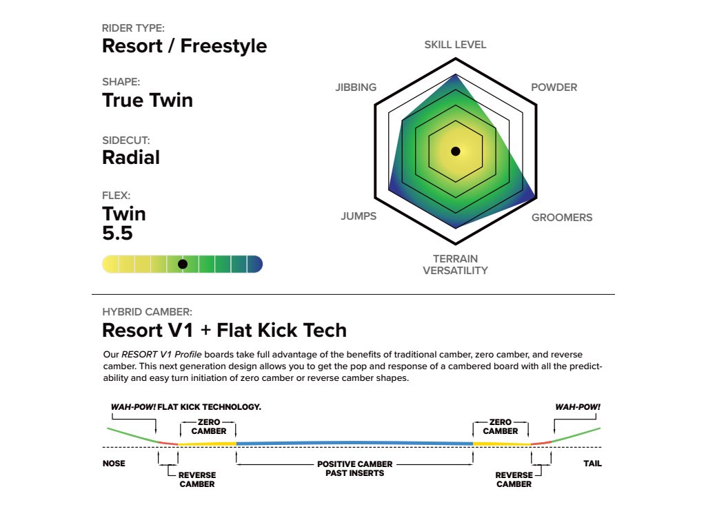 Vo vnútri nájdeš P2 Superlight Core™, spevnený Carbon Aramid Body Armor™, ktorý pridáva odolnosť na miestach, kde sa dosky najčastejšie lámu. Hybrid Camber ti dá stabilitu a pop, ale stále zostáva dosť hravý na to, aby si si užil park od rána do večera.